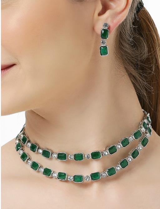 Silver-toned layered necklace, has green and white AD-studded details